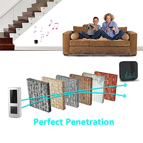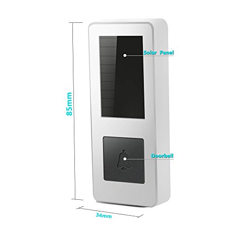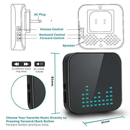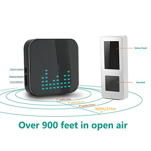 -. Feature : ★SUPER VOICE RANGE AND VOLUME SELECTION:52 different ring tones. Four levels of adjustable volume from 30db to 110db, Memory function for sound and chime selection.Press the bell shaped button to get desired volume level. / ★OPERATING RANGE AND OUTSTAND PERFORMANCE:over 900 feet of Operating range.A stylish modern design in classic black. Remote solar transmitter button is rated IP344 weatherproof and acceptable for outdoor use.Receiver is also a music player too,work lound. / ★SOLAR TRANSMITTER:No Batteries Required for the transmitter using environment friendly solar system.No power consumption. Don't worry to waste energy,solar system product is worldwide lifestyle.Use this item adds to your congraduation. / ★LONG LIFE:The transmitter silicone button can be push more than 100000 times,can be used more than 20years.Not the solar trainsmitter but the receiver are all superwaterproof adding the using sensor and life. / ★ EASY INSTALL:The transmitter can use double-sided tape or screws, plug the receiver ,easy to restall and use.Fit for House,villa or hosptial doorbell,elderly pager.Black,silver,golden,grey light available.