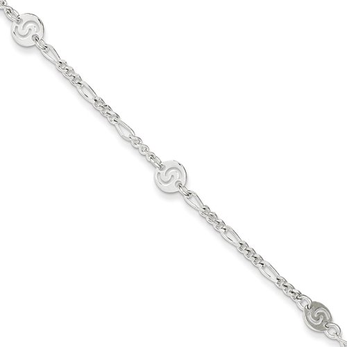 Want to draw more attention to your legs, try an eye-catching ankle bracelet that adds unexpected shimmer guaranteed to turn heads. Fashioned from polished sterling silver, this 9-inch anklet features a 2mm Figaro chain with 6mm cutout swirl discs, a 1-inch extender and a fancy lobster clasp.Feature