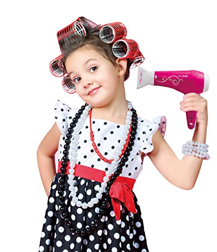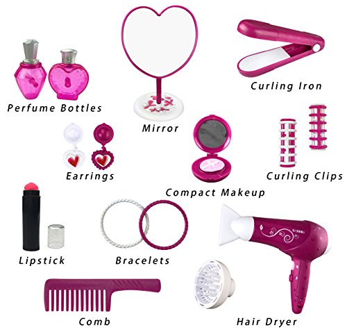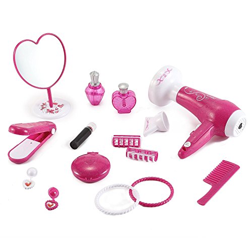 Welcome to the Fashion Studio! Cute Girls Beauty Salon Play Set gives your little princess everything she needs to stylize her look. This adorable play set features 16 fun beauty accessories. Features hair dryer, mirror stand, curling iron, curling clips, compact makeup, and comb. Motorized hair dryer that really blows air and hums! Hair dryer comes with 2 attachment pieces. Also includes soft tip lipstick, perfume bottles, bracelets, and earrings. This cute activity toy is a great way to encourage creative play and motor skill development. Your child will love having her own beauty tools to pretend curl her hair, or the hair of all her dolls. The toy hair dryer requires 1 AA battery (not included). Ages 3 and up.