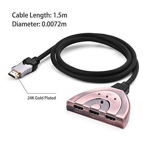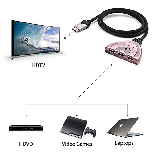 Description : HDMI cable with pigtail means 3 female ports to 1 male with nylon braided cable. Your are free to switch your output devices from those three female ports by pressing select button and the LED will light up.