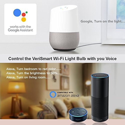 - WORKS WITH GOOGLE HOME AND AMAZON ALEXA AND IFTTT- Use your Voice to control all your VeriSmart light bulbs with Amazon Alexa and Google Home Assistant. You can create Groups such as Living Room Lights and ask Alexa or Google turn on, off, dim, brighten, or change the color of lights as a group. Or set Scenes such as Sunrise, Sunset, Back Home, Leave Home, and Good Night.