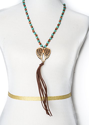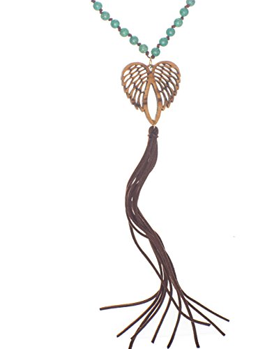 A long rosary blue and brown beaded necklace and earring set with a wooden angel wings medallion cut out pendant finished with a dangling faux leather tassle by Jewelry Nexus Jewelry Nexus is dedicated to introducing jewelry that fits the lifestyle of today's woman. Quality product and first-class customer service have contributed to our reputation. Jewelry Care Instructions: Don't wear your jewelry to bed. Please store your jewelry in a protective container and keep away from sunlight and moisture. For mild cleaning please use a Silver Polishing Cloth.Feature