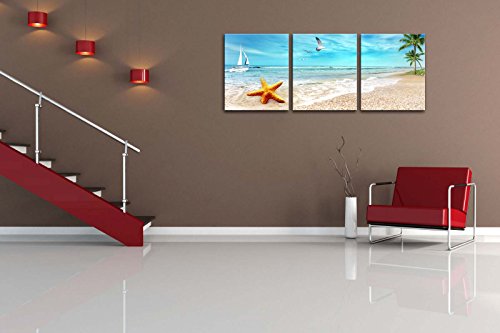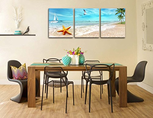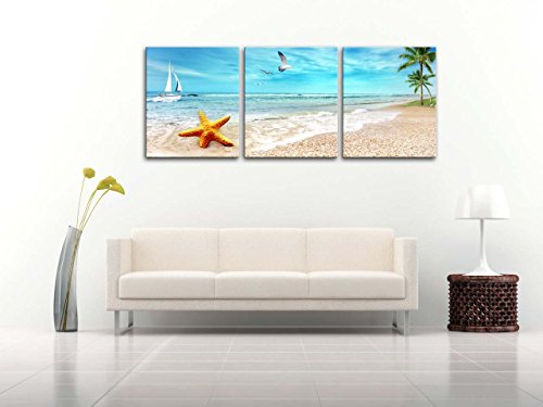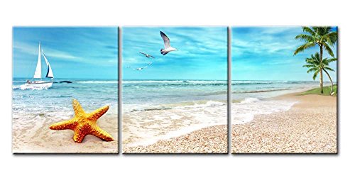 -. Title : Canvas P.R.Int Wall Art Painting For Home Decor Seascape Of Sandy Beach With Palm Trees Golden Starfish Sea Gull Flying In The Sky And Sailing Boat In Blue Sea 3 Pieces Panel Paintings Modern Giclee Stretched And Framed Artwork The Picture For Living Room Decoration Seascape Pictures Photo P.R.Ints On Canvas