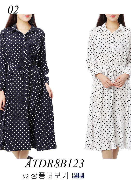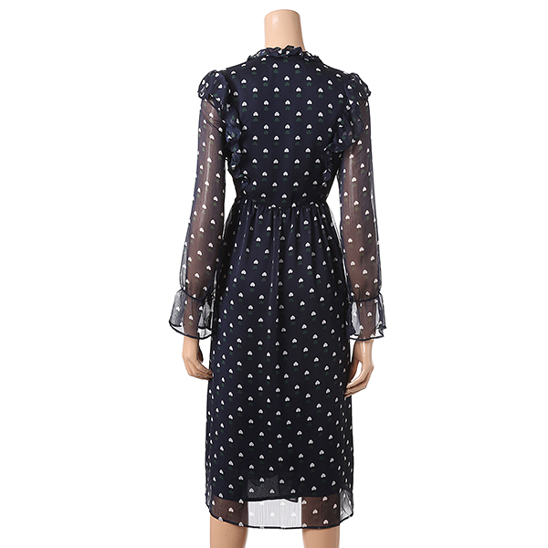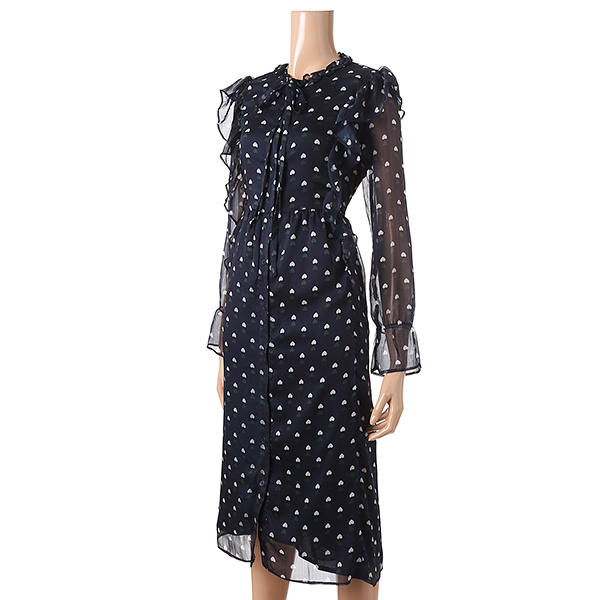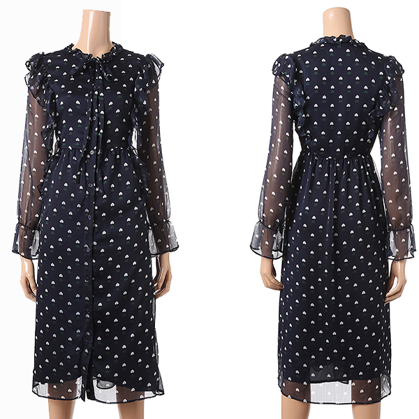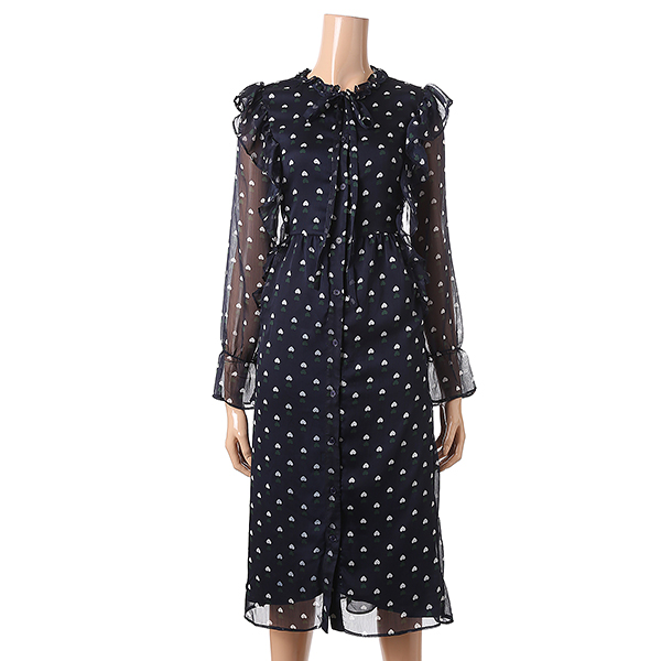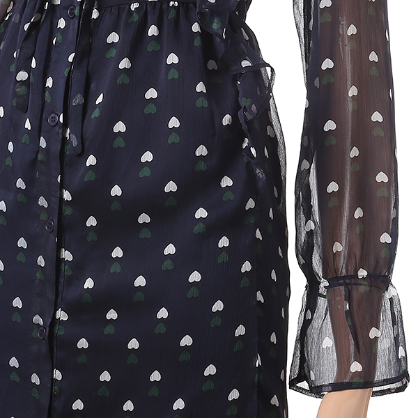 깔끔한 네이비 컬러에 하트 패턴과 러플장식으로 포인트를 준 셔츠형 원피스 입니다.