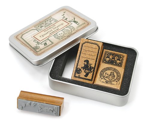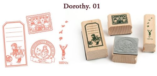 -. Feature : 4 wood mounted Wizard of Oz rubber stamps / Stamps come in a handsome tin case / Stamps come in 4 designs and sizes; Ink pad not included / Wood, rubber / 4" x 3" x 1" (tin)