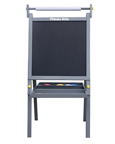 Pidoko Kids Standing Art Wooden Easel, Grey - Magnetic Dry Erase Board, Chalk Board and Paper Roller - 2 Sided A-Frame with storage compartment and paint cups - Art Station for Boys & Girls (Gray)