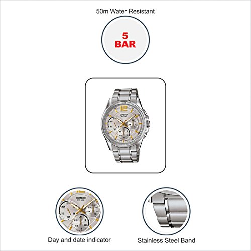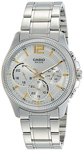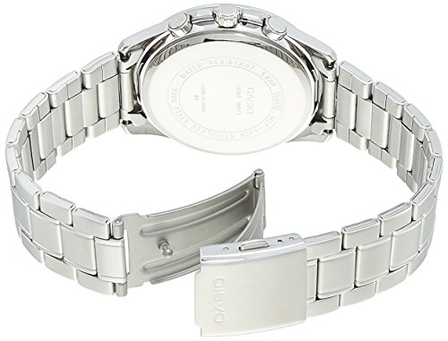 Brand, Seller, or Collection Name:Casio Model number:MTP-E305D-7AVDF (A993) Part Number:MTP-E305D-7A Item Shape:ROUND Dial window material type:Mineral Display Type:ANALOG Clasp:Buckle Case material:Stainless steel Case diameter:45 millimeters Case Thickness:10.50 Band Material:Stainless Steel Band length:Standard Band width:20 millimeters Band Color:Silver Dial color:Silver Bezel material:Stainless steel Calendar:Day and date Special features:water resist Item weight:4.32 Ounces Movement:Quartz Water resistant depth:100 Meters