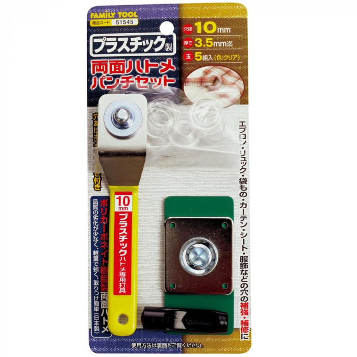 fk094igrjsポリカーボネイト樹脂製、品質の劣化が少なく、軽量で強く取りつけ簡単 サイズ 個装サイズ:3.5×20.5×9.6cm 重量 個装重量:200g 素材・材質 ポリカーボネイト 仕様 ■10mm(厚さ3.5mm迄)ハトメ玉:5組入 ■クリア ■下穴ポンチ10mm ■下敷き 生産国 日本 取りつけ簡単なハトメパンチセット ポリカーボネイト樹脂製、品質の劣化が少なく、軽量で強く取りつけ簡単