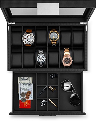 Glenor Co Watch Box with Valet Drawer for Men - 12 Slot Luxury Watch Case Display Organizer, Carbon Fiber Design - Metal Buckle for Mens Jewelry Watches, Men's Storage Boxes Holder has Large Glass Top