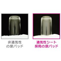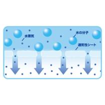 ネピア独自の高通気性シ-ト。シ-ト全面に開いているミクロの穴が、分子の大きい「液体」を通さず、分子の小さい「気体」だけを通します。ミクロの穴がおむつ内の湿気を外へ逃がして、ムレ・カブレを防ぎます。