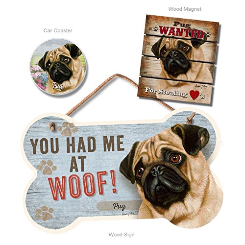 Pug Home Decor Bundle Pack (Dog Bone Sign, Car Coaster, Pallet Magnet)