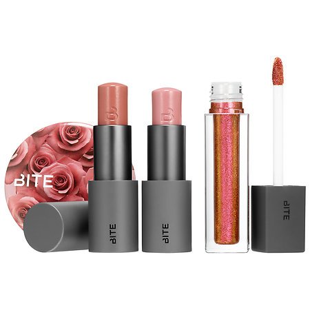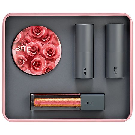 Color Love, Bite Lip Set - Cashew Multistick (rose taupe matte), Gelato Multistick (hazy plum with taupe matte), Rose Pearl Prismatic Pearl Crème Lip Gloss (metallic rose w/violet & green shimmer) What it is: A giftable trio with two Multisticks, a Prismatic Pearl Crème Lip Gloss, and a beautiful floral print mirror-all in a pink, collectable Bite Beauty tin. What it does: With 35 percent powder in each bullet, the Multisticks in this set go on like a cream and wear like a powder for blendable, buildable, breathable color for your eyes, lips, and cheeks. The Prismatic Pearl Crème Lip Gloss brings metallic, multidimensional shimmer to bare lips or lip color. This set contains: - 2 x 0.17 oz/ 4.75 g Multistick in Cashew (rose taupe matte), Gelato (hazy plum with taupe matte) - 0.14 oz/ 4 g Prismatic Pearl Crème Lip Gloss in Rose Pearl (metallic rose with violet and green shimmer) What it is formulated WITHOUT: - Parabens - Sulfates - Phthalates