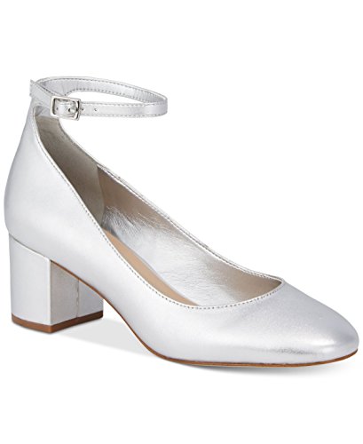 -. Feature : Almond-toe pumps with ankle strap and buckle closure / 2" covered block heel / Suede upper; silver: leather upper; manmade sole / Imported