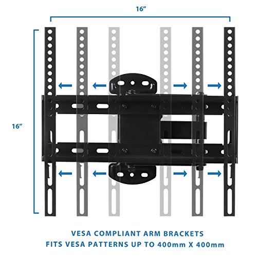 -. Feature : Universal TV wall mounting bracket design fits most of 20-50" LCD/LED/Plasma TVs on the market (even up to some 55 inch TVs) up to VESA 400x400 and 115lbs (Fits 400X400, 400X300, 400X200, 300X300, 300X200, 200X200, 200X100, 200X150, 100X100, 75X75mm). Please check the VESA (mounting hole pattern behind TV), stud spacing, possible blocked cable/input and your TV weight prior to making purchase decision to determine whether this TV wall mount fits your TV and the installation application. / This wall mounting kit is compatible with Samsung, Sony, LG, Sharp, Insignia, Vizio, Haier, Toshiba, Sharp, Element, TCL, Westinghouse 20,22, 24, 26, 30, 32, 40, 42, 48, 49, 50, 51, 52, 55 inch TVs. / Tilt, Swivel, Articulate, Extend, Collapse with this universal TV wall mounting bracket. Full motion capability makes it ideal for corner installation, over a fireplace, inside a TV center. This slim mount is designed to be installed on a single wall stud. TV stays as close as 3.25" from the wall or can extend up to 15 inches. Swivels left or right 90 degrees. / Continuous Tilt Feature (up to 12 degrees down or 2 degrees up) for Better Viewing Angle and Reduced Glare. Low-profile design ensures TV is close to the wall for a sleek finish. Cable management feature will neatly organize cables for a professional installation. / Weight rated to 115 lbs - This bracket is one of the strongest brackets available on Amazon. Install your precious TV with confidence. Constructed from Reinforced Steel. Quick and easy to install - bracket comes complete with full instructions, and FREE INSTALLATION HARDWARE