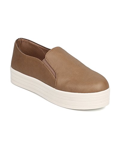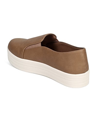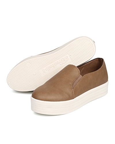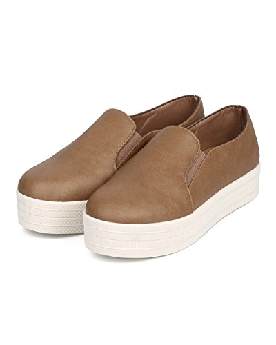 Breckelles DI31 Women Leatherette Round Toe Flatform Elastic Slip On Sneaker - Natural
