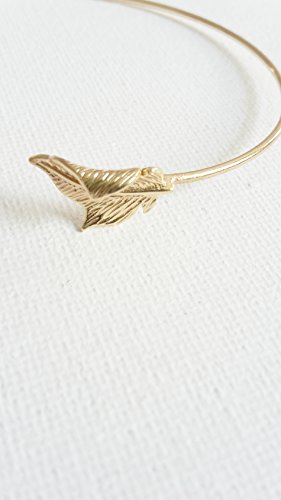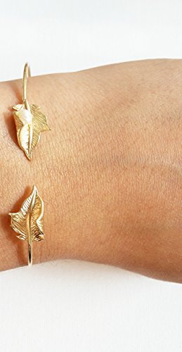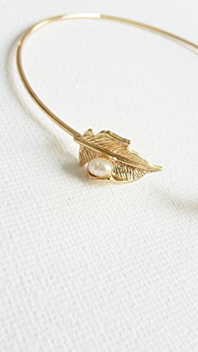 -. Title : 18k gold plated minimal adjustable thin bangle bracelet with leaves at the end and a freshwater white pearl