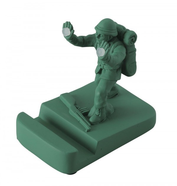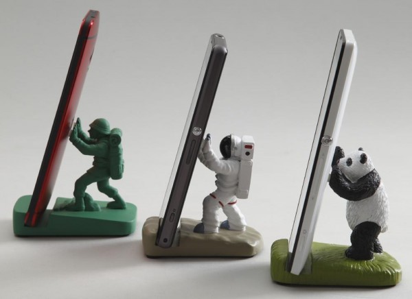 ユニークなキャラクターがスマホを倒さないように必死に支えます。