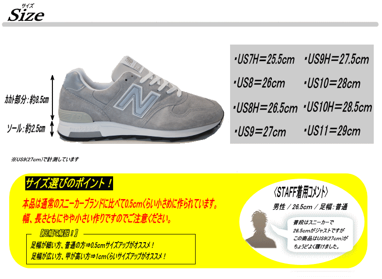 | サイズ | 作り⇒やや小さめ 【サイズ選びのポイント!】 足幅が細い方、普通の方⇒0.5cmくらいサイズアップがオススメ! 足幅が広い方、甲が高い方⇒1.0cmくらいサイズアップがオススメ! |