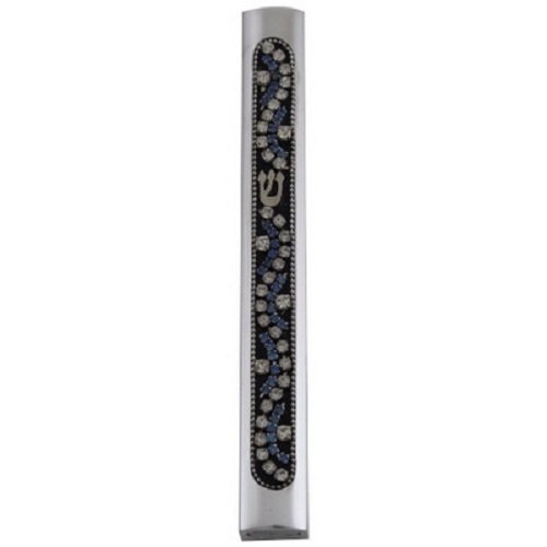 Mezuzah - Handmade Jeweled Home Blessing Cover, Aluminum - Silver With Black and Stone Design, 7 Centimeters