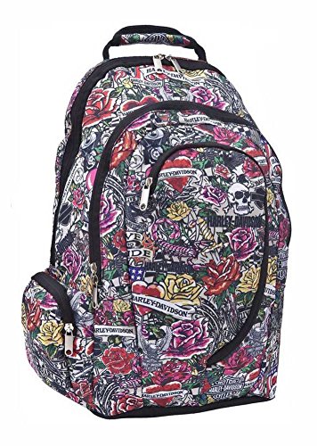 -. Feature : Harley-Davidson Multi-Functional Backpack / Tattoo Print / Four mesh foam lumbar pads for maximum comfort / Padded laptop compartment / Size: 19" x 13" x 8"