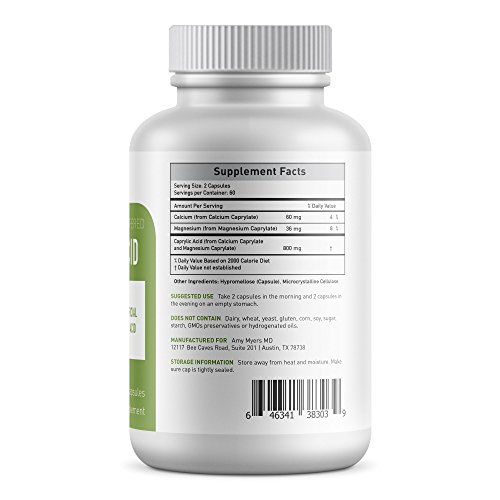 From Dr. Amy Myers: Best used with Candifense Candida Cleanse... When yeast is out of balance, begin caprylic acid and Candifense. First discovered in Goat's Milk, caprylic acid is a short chain fatty acid found in some mammal's milk, as well as in tropical oils like coconut and palm kernel oil. This marvelous fatty acid actually has a very beneficial effect on microbial balance in the gut, especially with regard dysbiotic yeast! >b>Formulate to provide maximum benefit. Many caprylic acid supplements just don't work because of the way they are formulated. Caprylic acid can be absorbed too soon or be damaged and even digested by stomach acid, gastric juices, and your pancreatic enzymes, rendering the product useless. Our formula is specially encapsulated and buffered with calcium and magnesium caprylates to protect its viability. Caprylic acid helps create a favorable environment for beneficial probiotics. Dr. Myers caprylic acid does a fantastic job of helping to promote the ideal environment for beneficial probiotic bacteria. Supports immune and thyroid health. By optimizing the probiotic environment, and supporting yeast balance in the digestive tract, caprylic acid supports a healthy and normally functioning gut barrier. When your gut barrier is intact, leaky gut is in check. Caprylic Acid is the right supplement for you if you're: - Tackling digestive tract yeast and candida balance issues - Wanting to optimize the gut environment for probiotic bacteria - Tired of the way other caprylic acid supplements make your tummy feel - Wanting to support your immune system and thyroid health Suggested usage: Take 1-2 capsules 30 minutes before a meal. Warning: Not to be taken by pregnant or lactating women.Feature