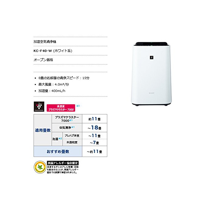 원본상품명: シャプ PM2.5加空機(空18まで/加11まで ホワイト系)SHARP 高濃度「プラズマクラスタ7000」搭載 KC-F40-W