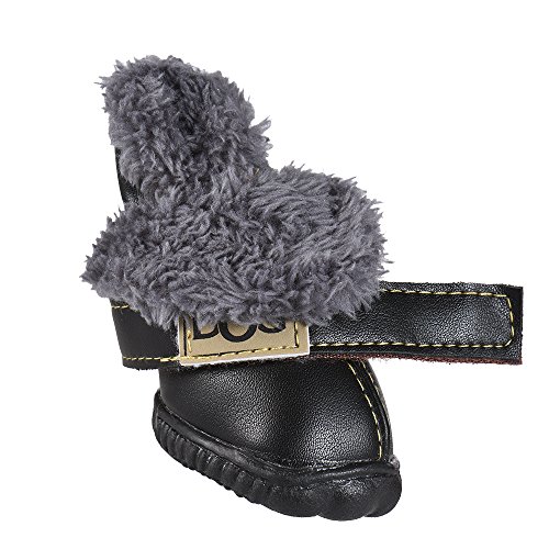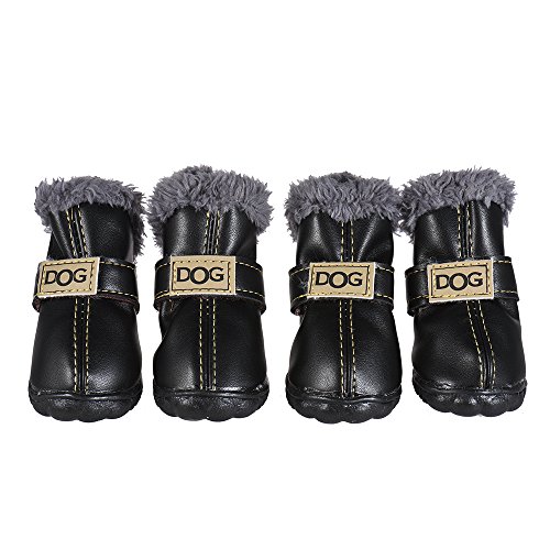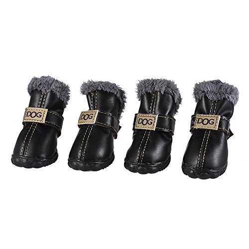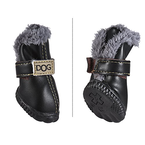 -. Feature : Water resistant PU leather dog shoes, with soft and warm lining inside. / Keep your dog's paws clean, and well protecting the pet's paws against wound. / Soft rubber sole ensures dog's Anti-slip walking. / Wide split opening, convenient to wear. / Fasten tape design fits comfortable and not easy to drop.