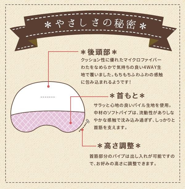 | 後頭部はマイクロファイバーわたと生地でふわふわもちもちの感触で、頭をやさしく包み込みます。首もとはサラッとしたパイル生地で、汗をかいても安心。パイプの出し入れも可能なので、お好みの高さに調節できます。 |