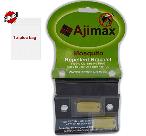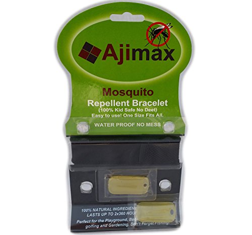 -. Brand : Ajimax -. Color : Black -. EAN : 0635833219321 -. Feature : ✔ MADE WITH QUALITY MATERIAL: Manufactured with high-quality and comfortable fabric. / ✔ NO SPRAY TECHNOLOGY: No more having to spray yourself or your loved ones. / ✔ PEST REPELLER WITH NATURAL INGREDIENTS: 4 Essential Oils -Citronella (0.2ml), Geranium (0.28ml), Peppermint (0.24ml), Lavender (0.31ml) / ✔ 2 FREE REFILLS: Comes with 2 refills for 30 days or more. / ✔ OUTDOOR PROTECTION: Worried about going outside because of the insects? -. Label : Ajimax -. Manufacturer : Ajimax -. PackageQuantity : 1 -. ProductGroup : Lawn & Patio -. ProductTypeName : OUTDOOR_LIVING -. Publisher : Ajimax -. Size : 5 x 2 x 9 inches ; 1.6 ounces -. Studio : Ajimax -. Title : Mosquito Repellent Bracelet By Ajimax, with 2 Free-refills 1 Bonus Ziploc Bag No-spray, No-liquids, No-mess, No-deet, 24hr Protection for Everyone Against Insect Bites -. UPC : 635833219321