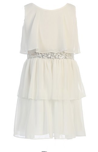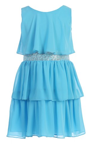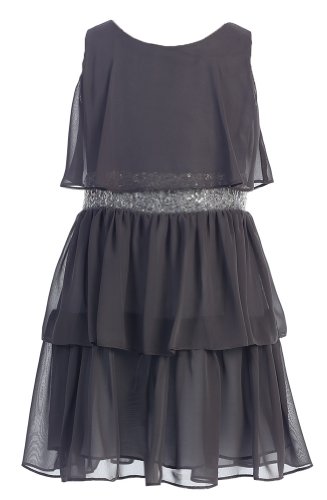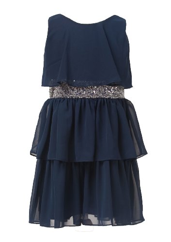Glamorous . . . Sequin Belted Sleeveless Triple Tiered Chiffon Party Dress; Knee Length Design Multiple Ruffled Chiffon Layers; Fully Lined with Back Zippered Closure; 100% Polyester; Hand Washable; ImportedFeature
