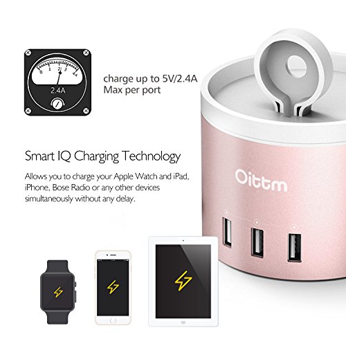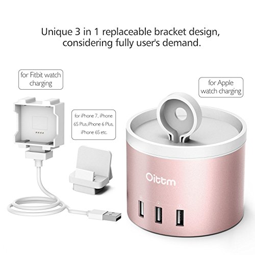 [The Oittm Advantage] 3 in 1 replaceable charging bracket for apple watch, iphone and fitbit blaze, fully considered user's needs. [4 Ports Mutilfutional Charger Stand] One inside USB port for the Apple Watch and three outside USB ports for other devices, supporting charging of all Apple Watch models & three USB 2.0 and 3.0 devices simultaneously (iPhone SE, iPad Pro, Samsung S7/Edge included).