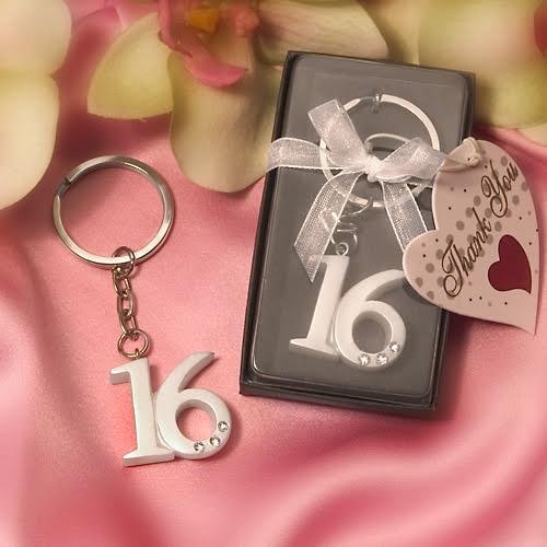 Studio : Fashioncraft Publisher : Fashioncraft Product Description She'll always be your little girl, but today she celebrates turning Sweet Sixteen - and these key rings make the perfect party mementos. Each measures 3" by 1" and features a bold 16 decorated with rhinestones, attached to a metal chain and ring. Part of Fashioncraft's own collection of key ring favors for every occasion, each comes attractively packaged in a deluxe clear gift box with black bottom wrapped with a white organza bow with a heart-shaped thank you tag attached. 0