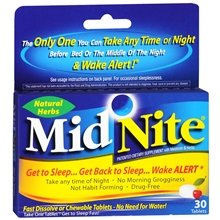 -. Binding : Health and Beauty -. Brand : Unknown -. EAN : 0188901000012 -. Feature : MidNite is made with all natural sleep ingredients, not drugs / MidNite is the only sleep remedy that can be taken at any time - even the middle of the night - with no morning grogginess -. IsAdultProduct : 0 -. Label : Groceries To Your Door -. Manufacturer : Groceries To Your Door -. MPN : Gro-5335 -. PartNumber : Gro-5335 -. ProductGroup : Health and Beauty -. ProductTypeName : HEALTH_PERSONAL_CARE -. Publisher : Groceries To Your Door -. Studio : Groceries To Your Door -. Title : MidNite Herbal Sleep Supplement Chewable Tablets 30.0 ea. (Quantity of 4) -. UPC : 188901000012