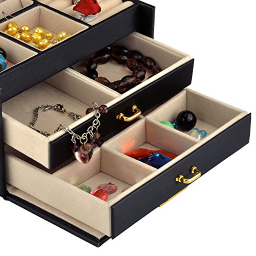 -. Feature : Made of quality black faux leather and soft beige velvet, this jewelry box is superexcellent to protect your beloved jewelry from scratch and damage / Lightweight to carry and cute enough to be a gift,1.83 Lbs (0.83 kg), 6.8" L x 5.5" W x 5.1" H (17.5 x 14 x 13 cm) / Multi-functional jewelry case, suits for necklaces, bracelets, watches, earrings, ear studs, hairpins, cufflinks, brooches and other jewelry, nice gift idea / Lock with a key ; mirror on top lid; removable earring holders£»The mini travel jewelry box is specially designed for journey, portable and space saving / 3 layers with 2 large drawers, 10 compartments in different sizes,1 ring set,2 ear stud cards,2 drop Earrings case
