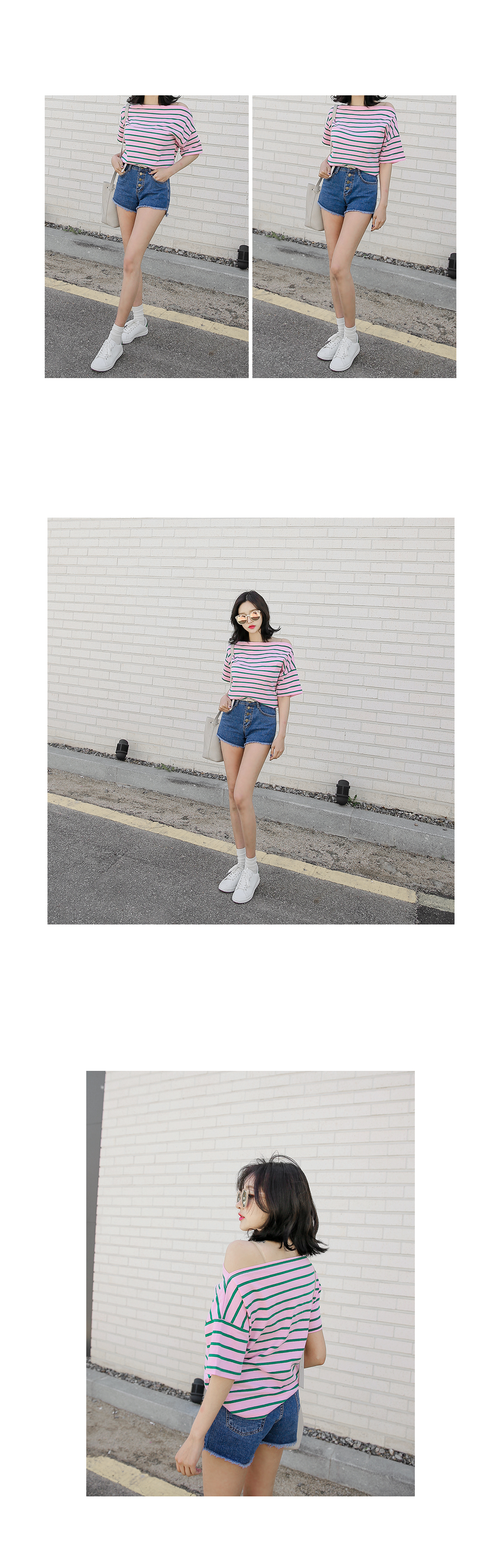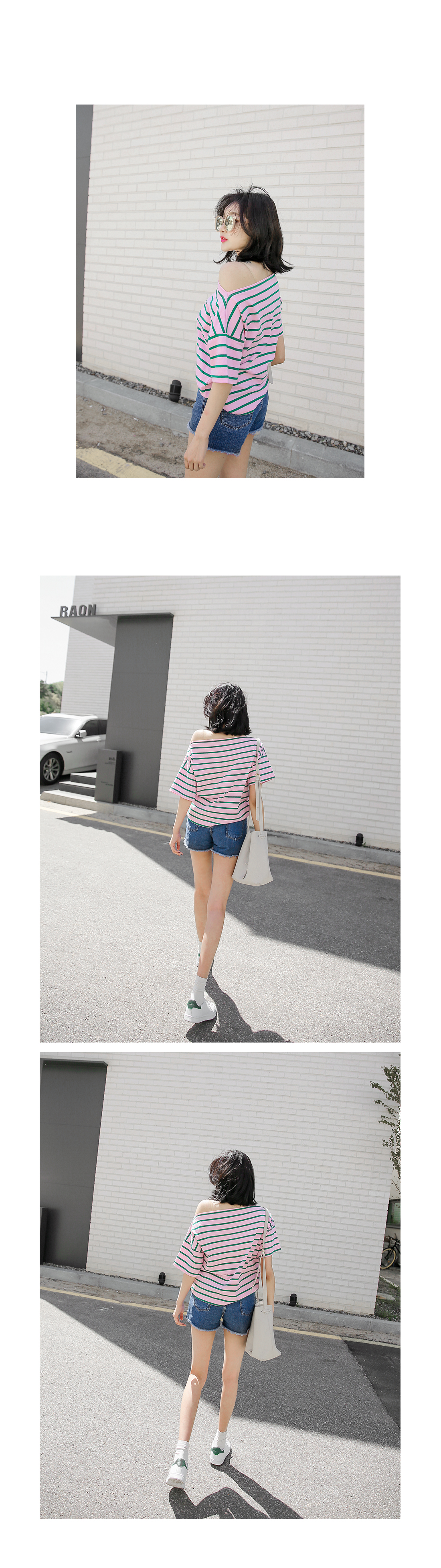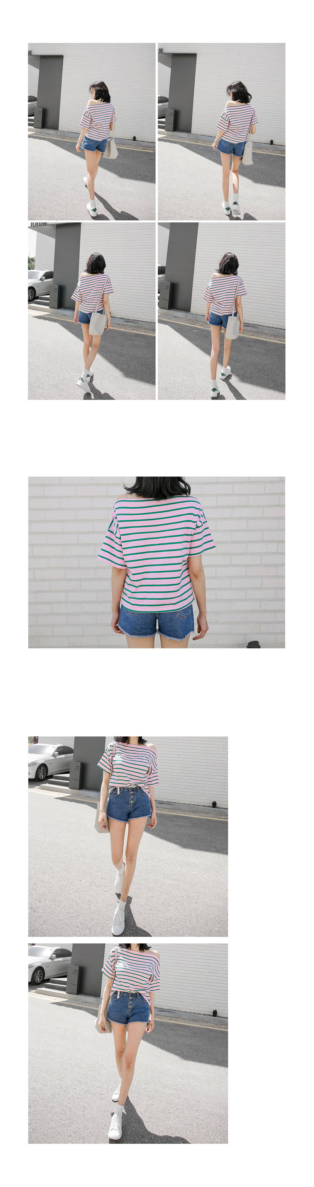 오프숄더 디자인으로 스타일리시한 분위기의 코디매치를 할 수 있는 티셔츠 아이템을 소개해드릴께요^^경쾌한 분위기의 배색된 컬러감이 돋보이는 스트라이프 패턴으로캐주얼한 분위기의 코디매치를 할 수 있는 티셔츠랍니다~팬츠, 스커트 등 다양한 아이템들과 함께 부담없이 데일리룩을 완성할 수 있어요~휴가룩으로 스타일리시하게도 연출이 가능한 티셔츠 아이템이랍니다~