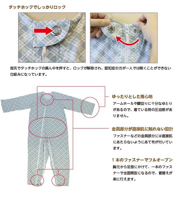 認知症の方の着脱予防に最適。一人では開けにくいタッチホックを使用した介護用パジャマです。