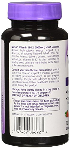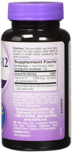 -. Binding : Health and Beauty -. Brand : Natrol -. EAN : 0602938292030 -. Feature : Active ingredients: vitamin b-12 5, 000 mcg (as cyanocobalamin) / This product made of high quality material / This product is manufactured in united states -. IsAdultProduct : 0 -. Label : Everready First Aid -. Manufacturer : Everready First Aid -. NumberOfItems : 1 -. PackageQuantity : 1 -. ProductGroup : Health and Beauty -. ProductTypeName : HEALTH_PERSONAL_CARE -. PublicationDate : 2016-06-18 -. Publisher : Everready First Aid -. ReleaseDate : 2016-06-15 -. Studio : Everready First Aid -. Title : Natrol Vitamin B-12 Fast Dissolve Tablets, 5000 mcg, Strawberry, 2 Count -. UPC : 602938292030