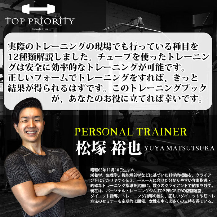 ・パーソナルジムTOP PRIORITY(トッププライオリティ)トレーナー松塚裕也監修のトレーニングブック付属(合計12種目のトレーニング方法を図解で説明しています。)
