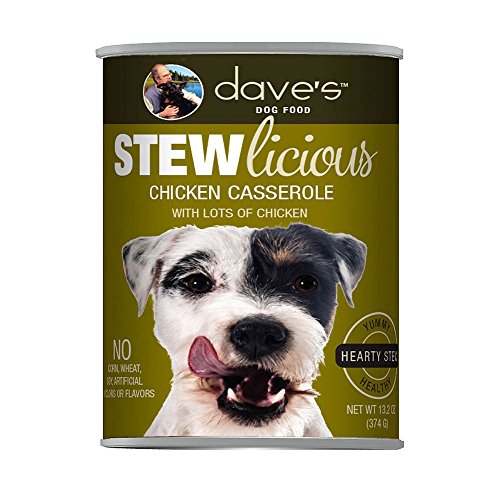 Dave's Pet Food is known for delivering healthy food at a great value, and their Stewlicious Chicken Casserole Canned Dog Food continues this tradition. The recipe combines mouthwatering chicken and chicken liver with carrots, green beans, wild rice, red peppers and nourishing fruits to create a nutritious casserole dish that's cooked just for your dog. This robust stew uses a rich chicken broth for a naturally delicious flavor with chunks of chicken and veggies you can see. There's no corn, wheat, soy or gluten, which means this wholesome meal is easier on the tummy and filled with more tasty meat for your pup to enjoy. Ingredients: Chicken Broth, Chicken, Chicken Liver, Potatoes, Dried Egg Product, Carrots, Green Beans, Peas, Wild Rice, Red Peppers, Guar Gum, Natural Flavor, Oat Fiber, Pea Fiber, Brewers Dried Yeast, Menhaden Fish Oil (Preserved with Mixed Tocopherols), Sodium Phosphate, Garlic, Sunflower Oil, Potassium Chloride, Parsley, Inulin, Dried Kelp, Flaxseed Oil (Preserved with Mixed Tocopherols), Sodium Carbonate, Salt, Oregano, Rosemary, Zinc Amino Acid Chelate, Iron Amino Acid Chelate, Dried Cranberries, Dried Apples, Dried Blueberries, Tricalcium Phosphate, Choline Chloride, Yucca Schidigera Extract, Vitamin E Supplement, Copper Amino Acid Chelate, Manganese Amino Acid Chelate, Sodium Selenite, Thiamine Mononitrate, Cobalt Amino Acid Chelate, Niacin Supplement, D-Calcium Pantothenate, Vitamin A Supplement, Riboflavin Supplement, Biotin, Vitamin B12 Supplement, Potassium Iodide, Pyridoxine Hydrochloride (Vitamin B6), Vitamin D3 Supplement, Folic Acid, Rosemary Extract.Feature
