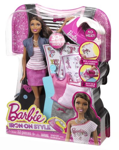 Barbie Iron-On Style African-American Doll: Once again, Barbie doll proves fashion is all about fun - and it's even more fun when you're the designer The Barbie Iron-On Style doll comes with the fashions and tools girls can use to create their own printed t-shirts. The more than 32 pieces include multiple fashions and decal sheets along with a no-heat “iron,” a dress form to iron on and a hip-looking Barbie doll. Select any of the fashions - tops, skirts and even a “denim” vest is included - then choose the perfect decal. Put the item on the dress form, place the decal on the clothing, then rub with the “iron” to complete the transfer and permanently apply! It's so easy! Girls will love creating looks that are totally their own. With three tops, two skirts, one jacket and more than 30 decals, girls can mix and match styles, colors and fun! Includes Barbie doll, iron, dress form, three decal sheets, three tops, two skirts, one vest, one pair of shoes and a fab necklace. Doll cannot stand alone. Ages 5 and older.Feature