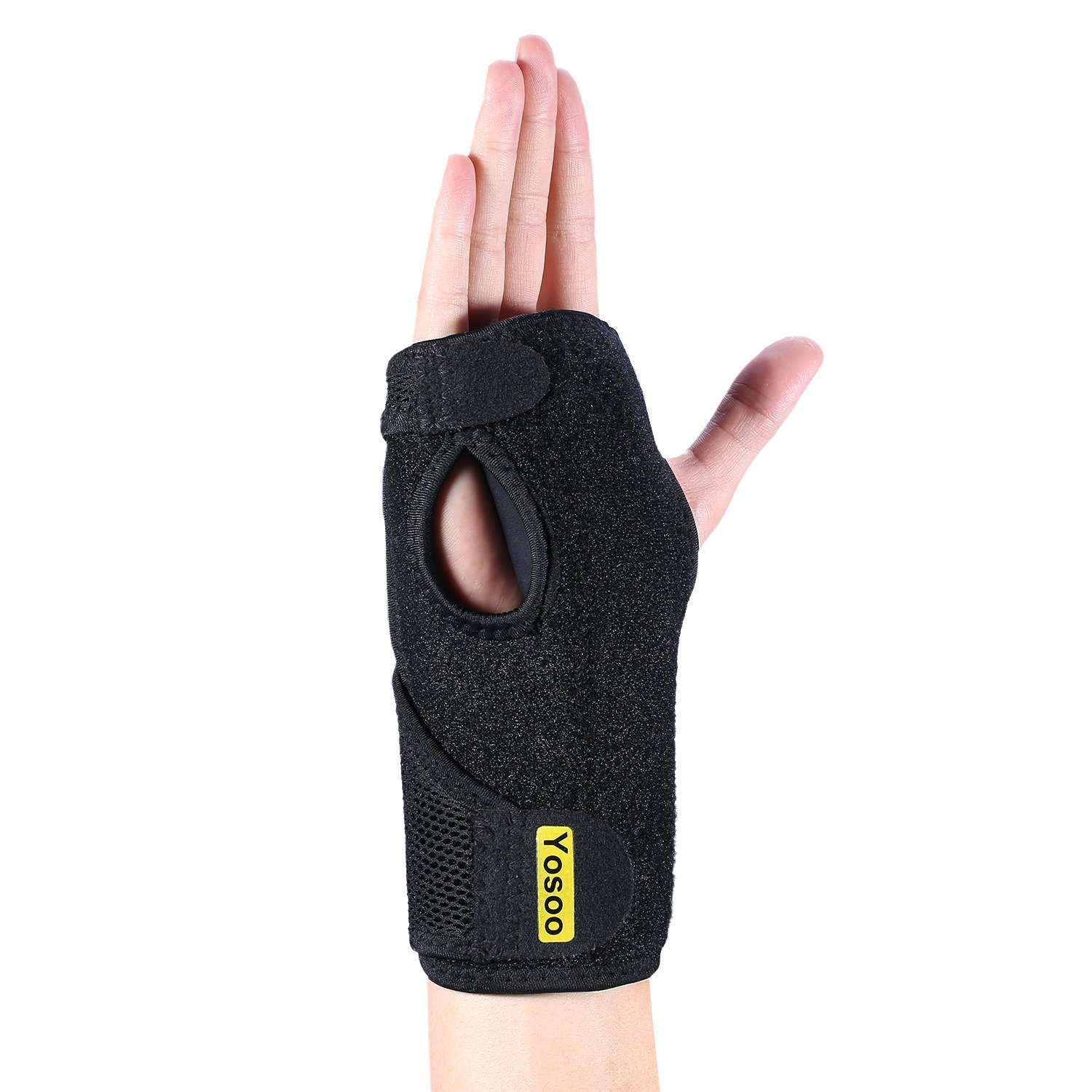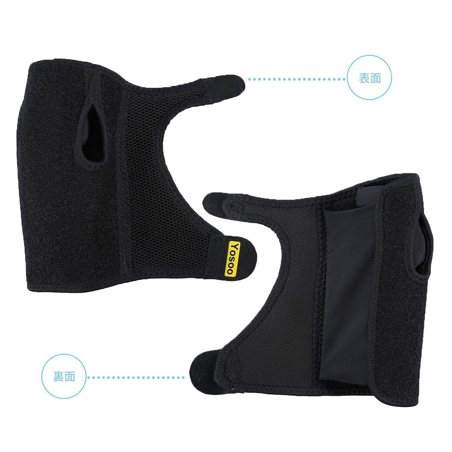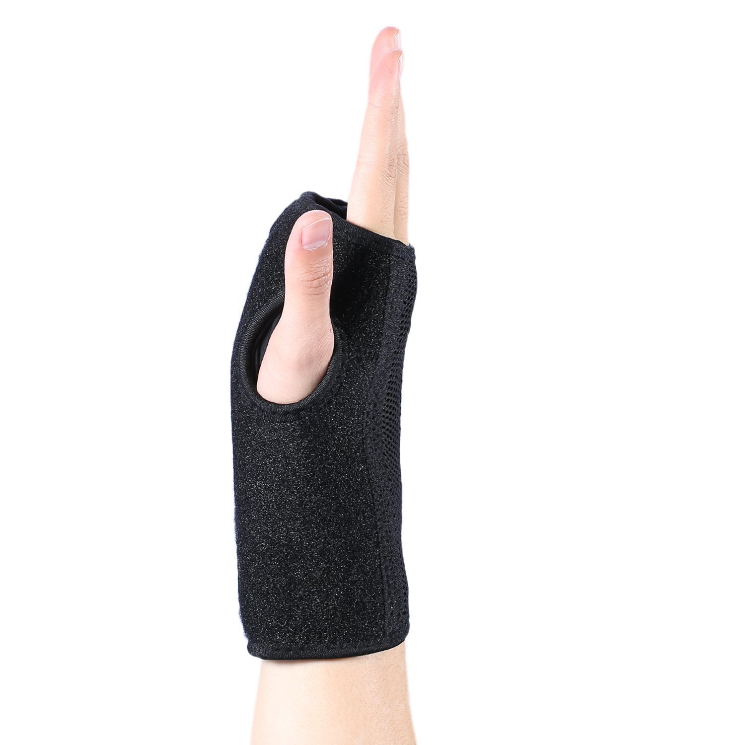 Holes that snugly fit the thumbs at both ends prevent the supporters from shifting without disturbing the movement of the thumb.
