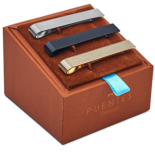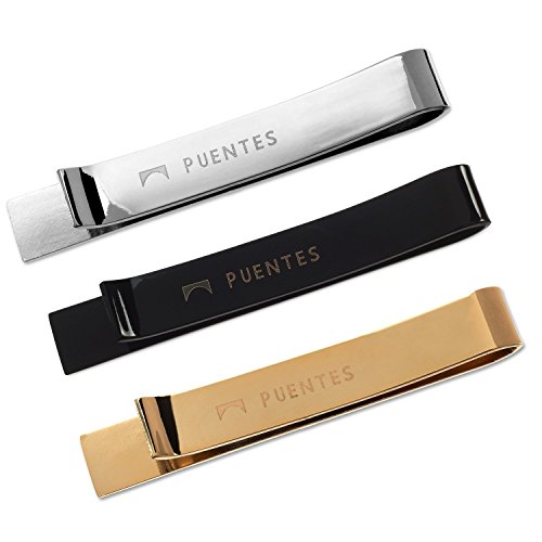 Studio : Puentes Denver Publisher : Puentes Denver Binding : Jewelry Product Description Puentes Denver's collection has been meticulously designed out of reverence for simple sophistication, resulting in a collection that seamlessly integrates into any lifestyle, from day to night, from work to play and any occasion in between. With a deft hand for quality and a discerning eye for timeless style, Puentes Denver's collection is designed especially for the modern man. Size - length: 2.15 inches long - ideal of normal, traditional width ties (neckties 3.25 inch - 3.5 inch wide), have a narrower tie and want a shorter tie clip?. Included in your purchase: 1 silver-tone tie clip, 1 gold-tone tie clip and 1 black tie clip will ensure you will have a tie clip for every occasion from day to day work days, wedding, funeral or a night out on the town. Top quality clasp: New and improved sturdy and solid clamp ensures your favorite tie will not move throughout your busy day. How to wear a tie clip: The tie bar or tie clip should be worn between the 3rd and 4th buttons on your dress shirt for a sharp look. Presented in a deluxe gift box: Your tie clip set arrives in a deluxe Puentes Denver gift box for a perfect presentation or as storage of your tie clips, cufflinks etc. Official Puentes Denver product. 0