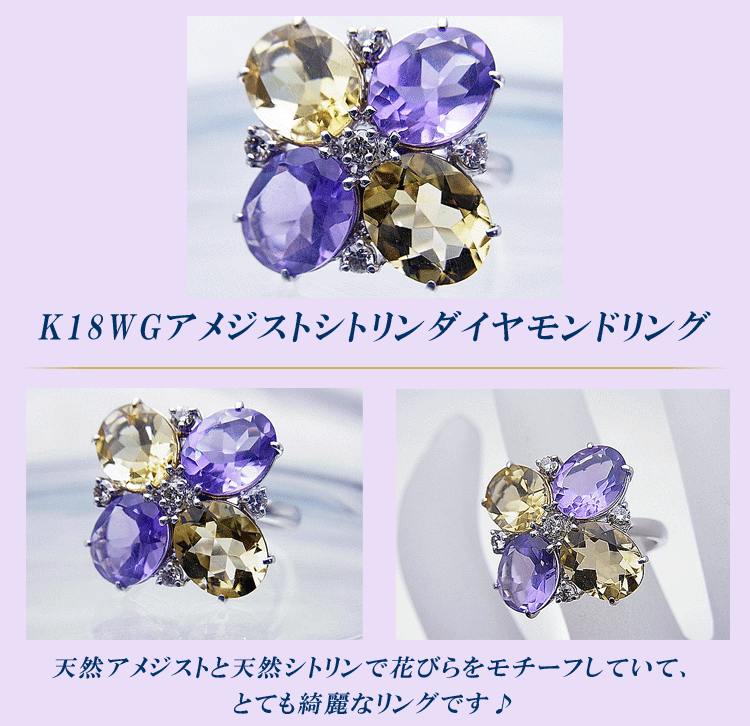 商品説明 天然アメジストと天然シトリンで花びらをモチーフにした綺麗なK18ホワイトゴールドリングです。