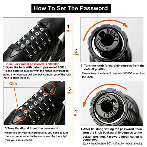 Operating Instructions: This lock is preset to operate at 00000. To set your own combination, follow the steps below: 1. Dial the combination wheels to 00000 and withdraw the cable. 2. Turn the knob 90 degrees clockwise to the designated position. 3. Reset the combination wheels to the desired combination, making sure the numbers are lined up with the pointer. 4. Have selecting your combination numbers, turn the knob back to the original position in a counterclockwise direction. 5. The new combination is now set. 6. Repeat the 1-5 steps above to reset the combination anytime you like.
