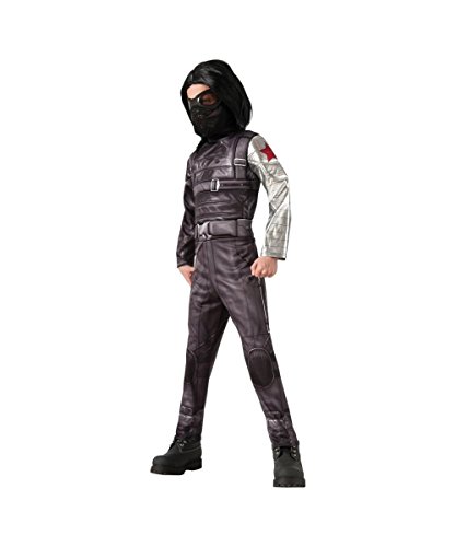 -. Brand : Rubie's -. Color : Multi -. Department : boys -. Feature : Jumpsuit and fabric mask. / Wig and shoes. / Boys' Small (4?6), Medium (8?10), and Large (12?14). / Excludes wig and shoes. / Includes jumpsuit and fabric mask. -. ProductGroup : Apparel -. ProductTypeName : APPAREL -. Title : Captain America 2 Winter Soldier Bucky Boys Halloween Costume deluxe
