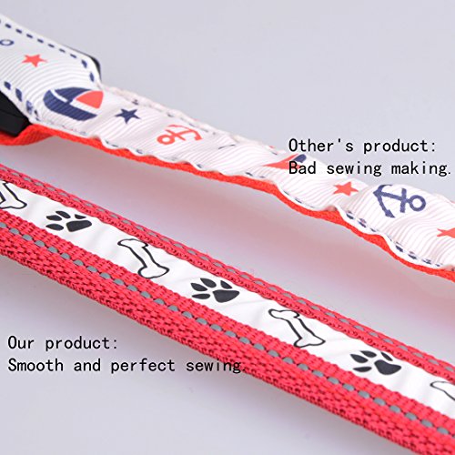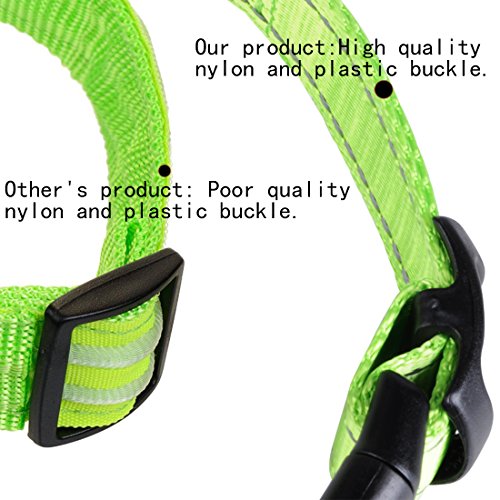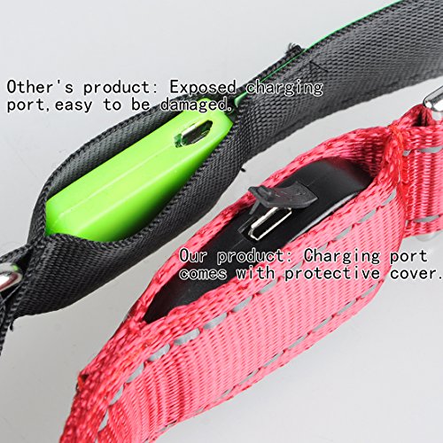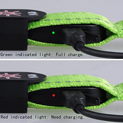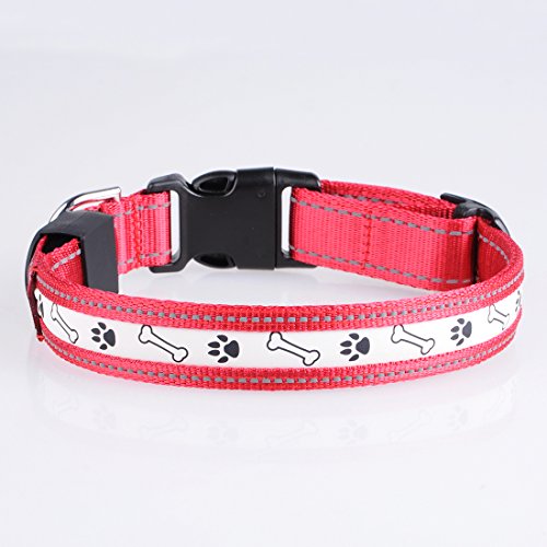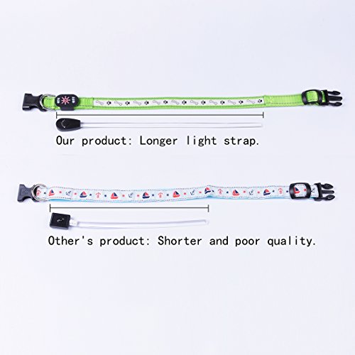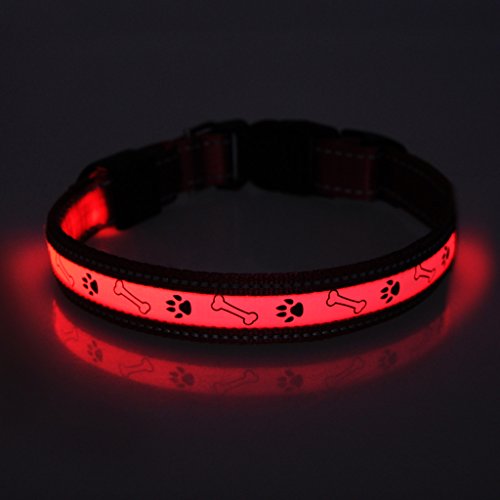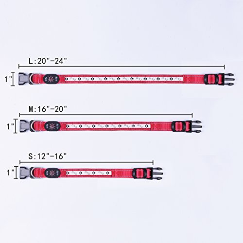 Size: S (Length: 12"-16" Width: 1") Main material: Nylon Color: Red Product Features: 1.Removable LED light: Can wear the collar in daytime,and leave the LED light at home for charging.(The USB charging interface is NOT waterproof,so recommend to remove the collar when bathing or playing on the beach.) 2.Three flashing modes: fast flashing-slow flashing-lighting constantly. You can choose the mode as needs,let your pets walk safely at night. 3.Long time lighting: Lighting lasts about 10 hours! Full charge needs 2-3 hours only,and the charging port comes with protective cover. Package will come with a charging wire. 4.Lovely pattern and beautiful color: Cute dog paws and stones pattern,and different colors for choices,looks nice on pets.If you buy it for cat,please measure his neck's perimeter and check the length of collar before place order. 5.Durable for daily use: Adjustable collar,nylon material,high quality plastic buckle,smooth and perfect sewing,make pets feel confortable with it. 0