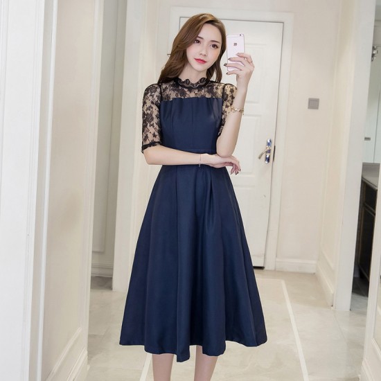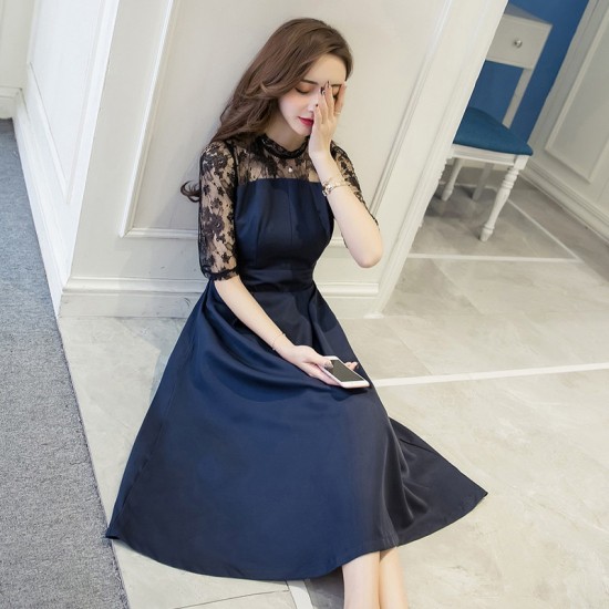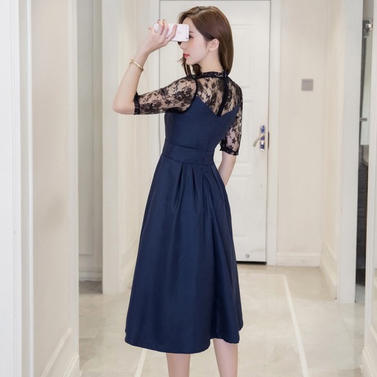 ワンピース ミモレ丈 レディース ドレス レース 花柄 刺繍 シースルー 5分袖 切替え ハイネック Aライン ネイビー 大人 上品 パーティー お呼ばれ drgz0737