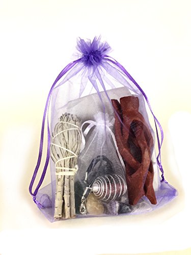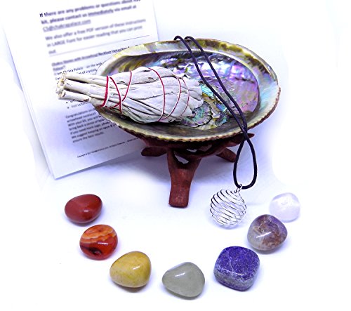 Chakra Stone Set with 7 Crystals, Sage, Abalone Shell, Wood Stand, & Cage Pendant Spiritual Healing Crystal, Smudge Gift Kit