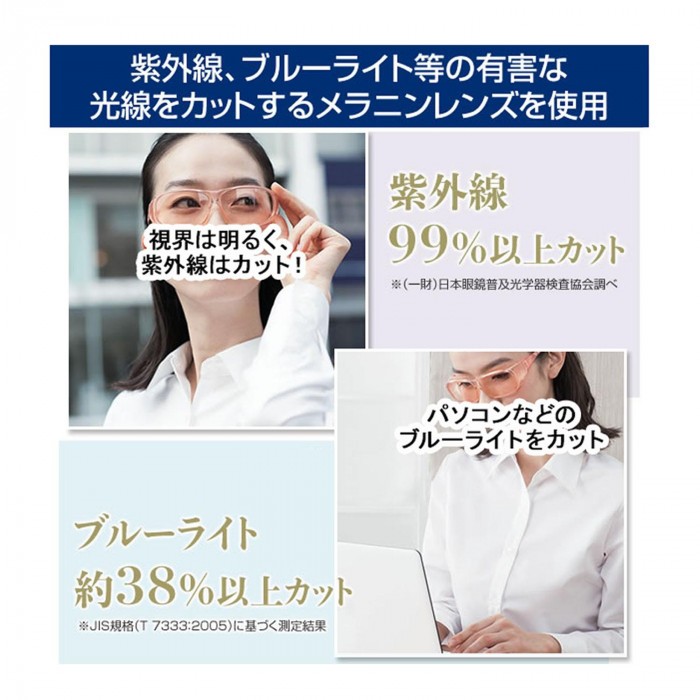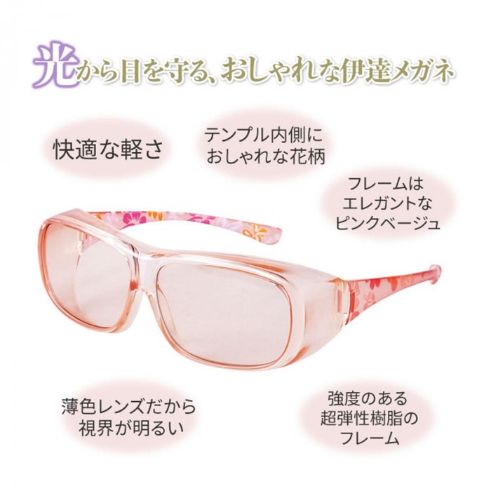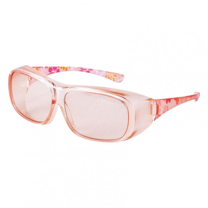| 外でも内でも紫外線やブルーライトから目を守る素敵なデザインの伊達メガネ。オーバーグラスタイプでメガネの上からかけられる。UV99%以上カット。ブルーライト約38%カット。ピンクベージュのフレームで素敵な表情を演出。弾性と復元性に優れた超弾性樹脂をフレームに採用。 |
