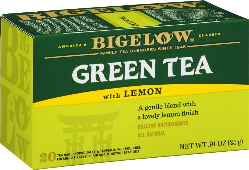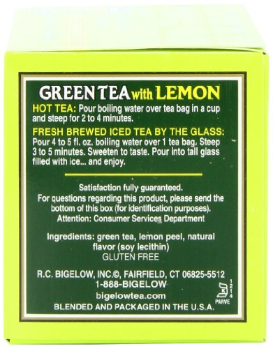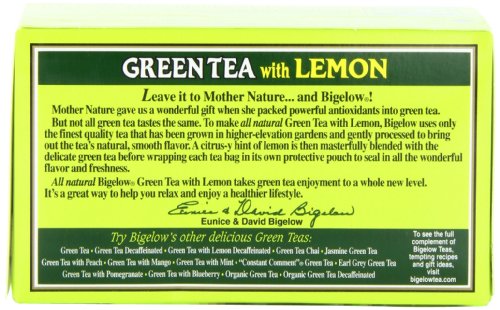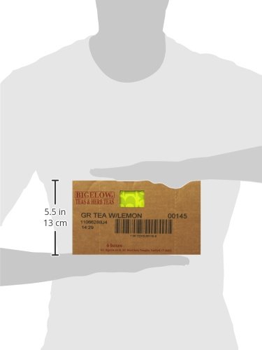 -. Binding : Grocery -. Brand : Bigelow Tea -. EAN : 0072310001459 -. Feature : Pack of six 20-count boxes of calorie-free green tea (120 total tea bags) / Delicate green tea flavored with lemon / Gluten free, with no calories and no carbohydrates; Kosher Parve / An excellent source of healthy antioxidants / Ships in Certified Frustration-Free Packaging -. IsAdultProduct : 0 -. Label : Bigelow -. LegalDisclaimer : Actual product packaging and materials may contain more and different information than what is shown on our website. We recommend that you do not rely solely on the information presented and that you always read labels, warnings, and directions before using or consuming a product. -. Manufacturer : Bigelow -. Model : 7231000145 -. MPN : 529029-00145 -. NumberOfItems : 6 -. PackageQuantity : 6 -. PartNumber : 529029-00145 -. ProductGroup : Grocery -. ProductTypeName : GROCERY -. Publisher : Bigelow -. ReleaseDate : 2006-06-22 -. Size : 6 Pack -. Studio : Bigelow -. Title : Bigelow Green Tea with Lemon, 20-Count Boxes (Pack of 6) -. UPC : 072310001459